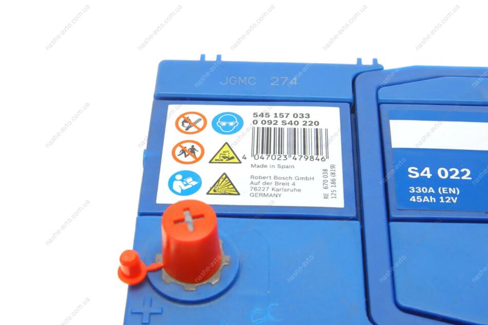 Аккумулятор 45Ah-12v (S4022) (238x129x227),L,EN330 (Азия) тонк.клемми BOSCH 0092S40220