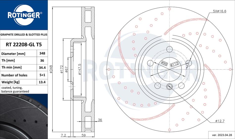 Диск тормозной передний правый BMW 3 (G20/G80/G28), 4 (G22/G82), 5 (G30/F90) [34 ROTINGER RT22208GLT5