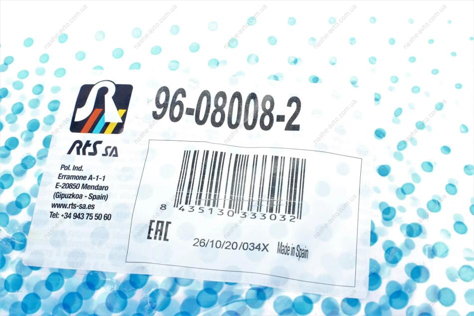 RTS — испанская компания, на протяжении более 35 лет производит рулевые и подвесочные запчасти для легкового и коммерческого транспорта. Продукция изготавливается на собственных заводах в Европе по стандартам OE, с регулярным внедрением инноваций и строгим контролем качества. Компания ежегодно выпускает более 500 новых изделий, а общий объём производства превышает 10 миллионов деталей. RTS поставляет товары в более чем 75 стран, обеспечивая сертификацию по ISO 9001, ISO 14001 и EAC.