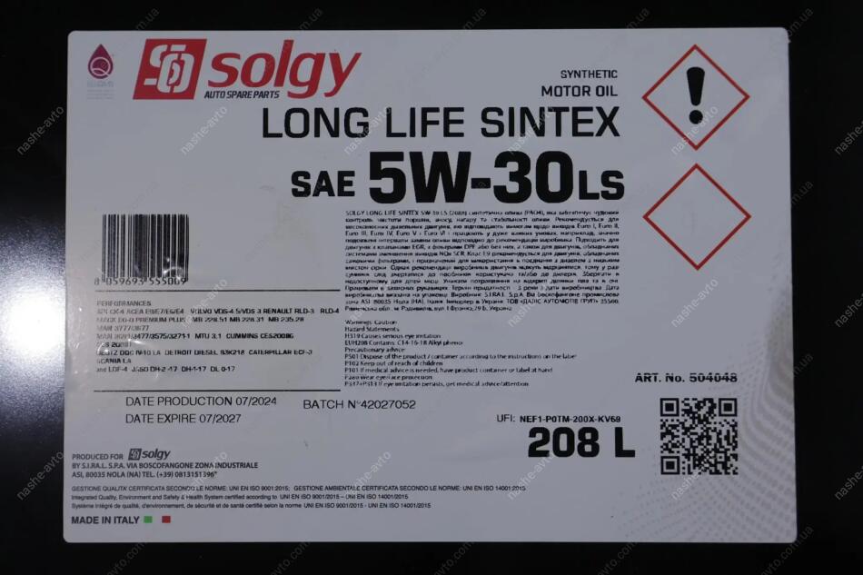 Олива моторна LONG LIFE SINTEX 5W-30 LS (208 L) SOLGY 504048