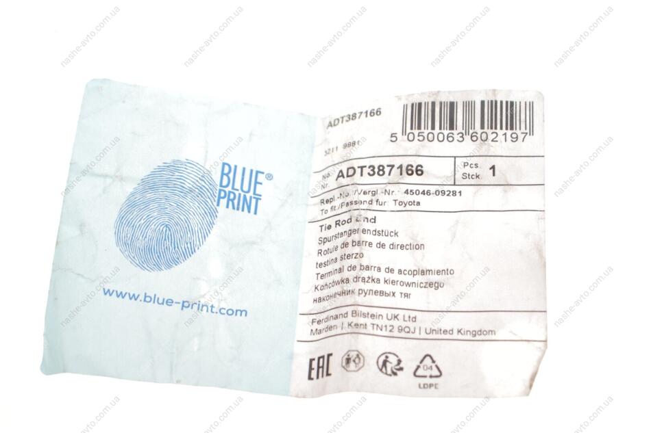 Наконечник рульової тяги з стопорною гайкою і шплінтом BLUE PRINT ADT387166