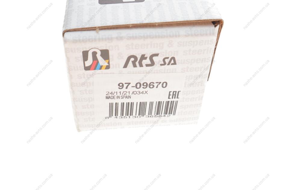 RTS — іспанський бренд з понад 35-річним досвідом, що спеціалізується на виготовленні компонентів рульового управління та підвіски для легкових і комерційних автомобілів. Продукція випускається на власних європейських заводах згідно зі стандартами OE‑класу, із застосуванням передових технологій і суворим контролем якості. Щороку компанія розробляє понад 500 нових артикулів, а обсяги виробництва перевищують 10 мільйонів деталей. RTS експортує товари в понад 75 країн, надаючи гарантію на продукт та відповідаючи сертифікації ISO 9001, ISO 14001 та EAC.